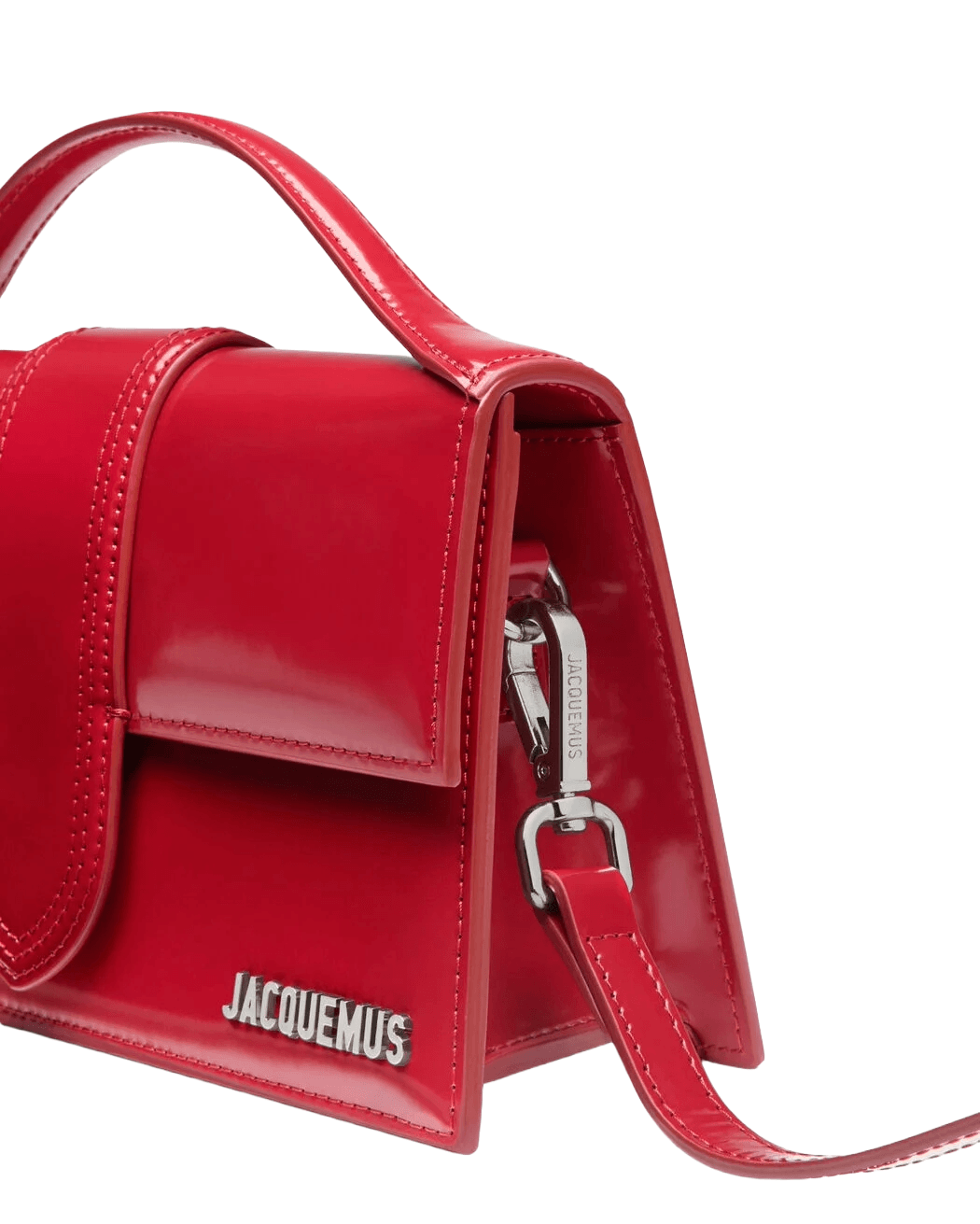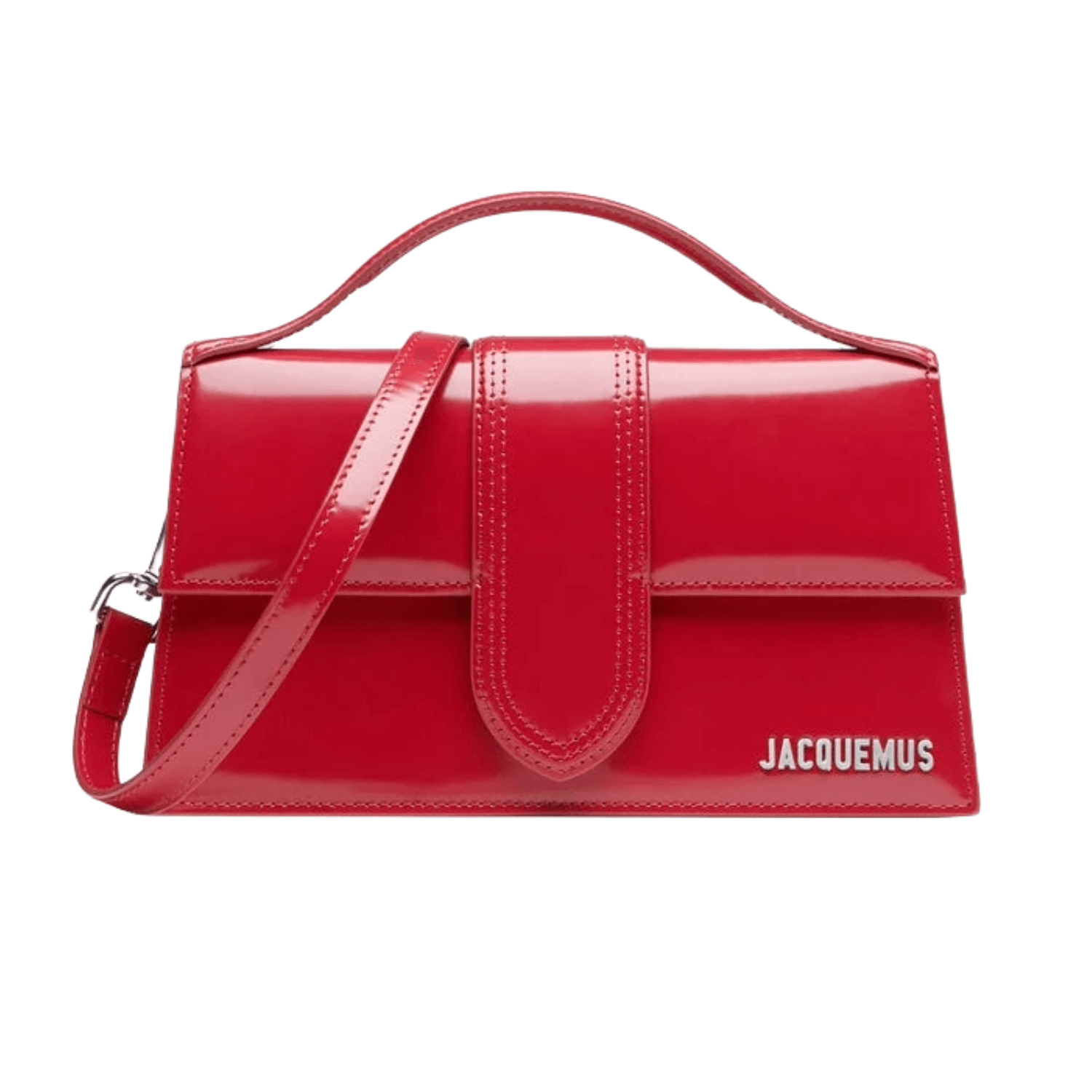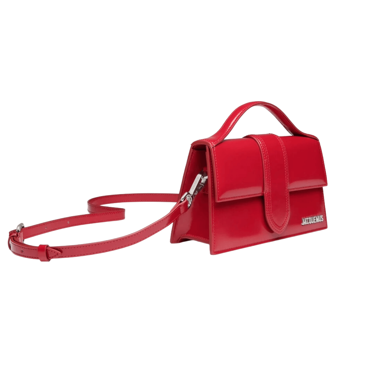 Jacquemus red patent leather crossbody bag with a structured silhouette, silver logo detail, and adjustable shoulder strap.