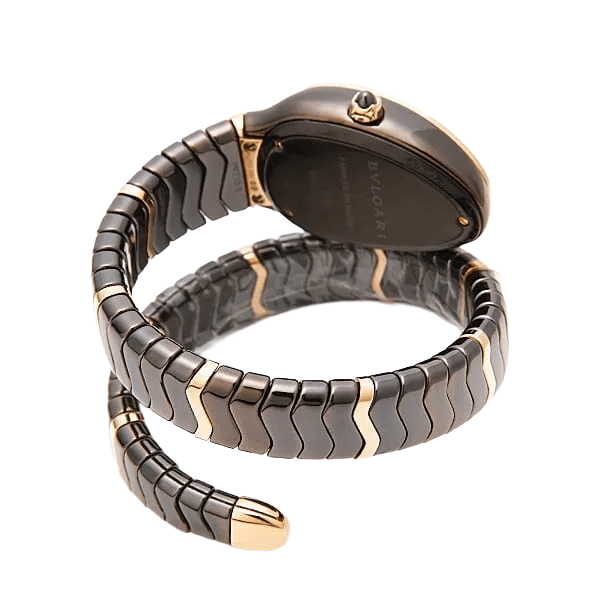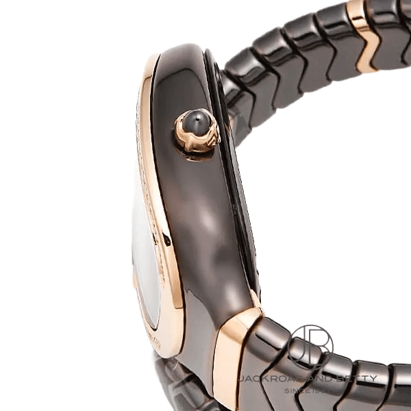 Discover the striking Bvlgari Serpenti Spiga, an iconic timepiece that fuses fine watchmaking with sculptural artistry. Crafted from polished 18K pink gold and high-tech brown ceramic, this watch coils elegantly around the wrist with its signature spiral design, evoking the sensual form of a serpent. The bezel is adorned with brilliant-cut diamonds, while the deep black dial creates a bold contrast for refined elegance.